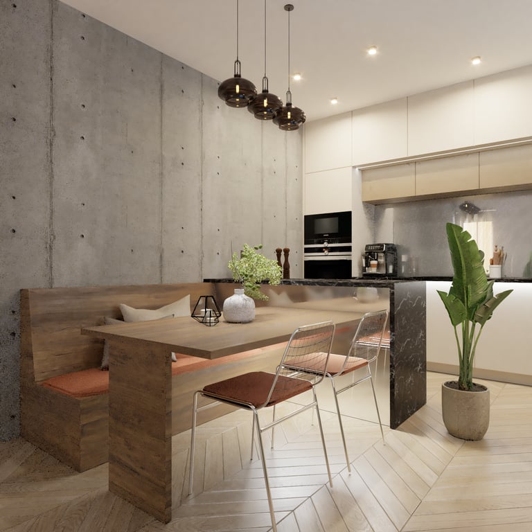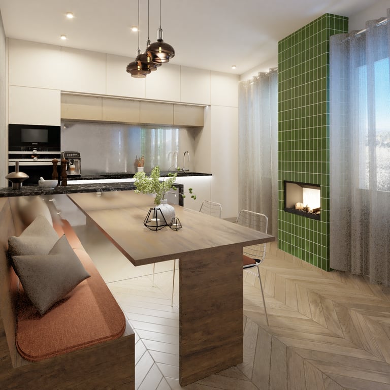 Avant de s’engager dans un achat pour rénovation, notre client souhaitait se projeter et connaître les possibilités qui s’offraient à lui dans cette maison de village. Voici un des 4 étages qui composent la maison qui devait être destiné à la cuisine et à la salle à manger. L’objectif était d’avoir un maximum de rangement et un coin pour recevoir de manière conviviale. Le petit + : on a réutilisé un vieux conduit de cheminée pour redonner tout son charme à la pièce!